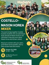 - October 13, 2025Connect with your fellow Business majors that are interesting in studying abroad at Mason Korea. Stop by to learn more about Mason Korea, grab GMU swag, and try delicious Korean food and snacks!